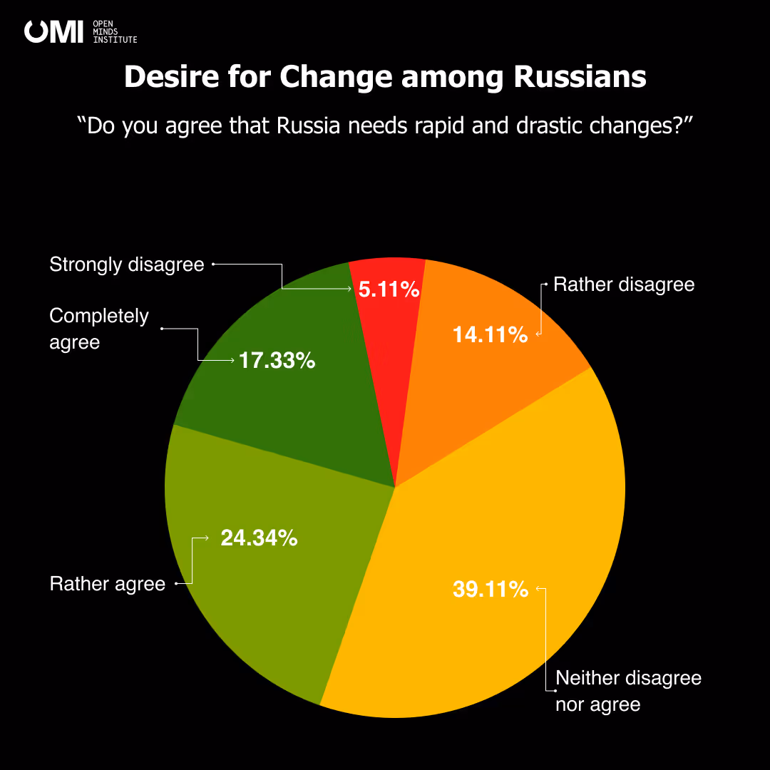 The sentiment for rapid and drastic change is strong in Russia, with 41.67% of respondents agreeing with this statement. In contrast, a smaller proportion, only 19.22%, disagrees with the need for rapid and significant changes. However, the nature of the desired changes remains unclear from the survey responses. Some respondents may wish for actions as extreme as full annexation of Ukraine, war with the United States, or the implementation of a totalitarian regime in Russia.