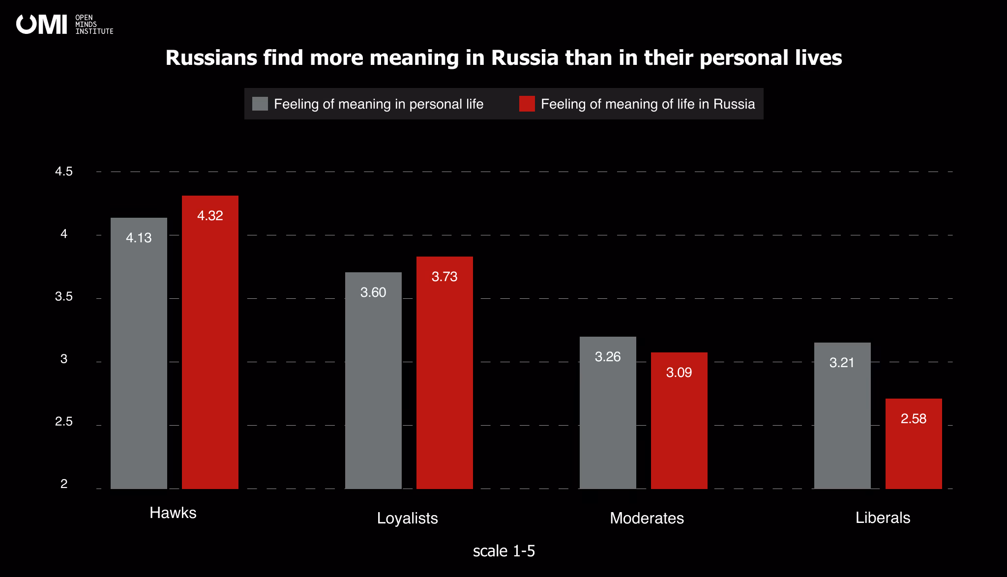 While Hawks understand what is going on in Russia and are ready to fully devote themselves to national interests, Liberals feel life in modern Russia is empty and meaningless. Along with that, these respondents have the worst financial condition and mentioned it has deteriorated during the last half of the year. All of this is reflected in their emotional condition — this group's stress and anxiety level is the highest.