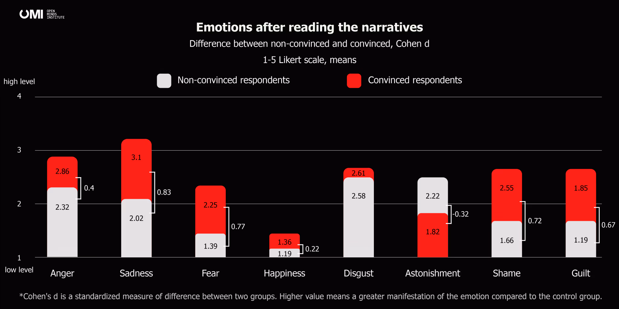 Negative emotions related to the experimental narratives were common for all respondents, regardless of political convictions. At the same time, those respondents who agree with the narratives (most likely, such group is also from the pro-peace camp) experience negative emotions more intensively than the representatives of the pro-war group covered by our study.