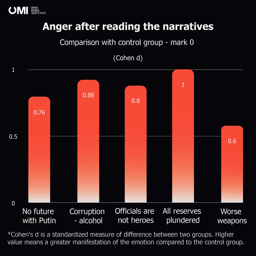 Respondents experience negative emotions (anger, sadness, fear, disgust, but, in all cases, with no significant sense of guilt) after reading the tested narratives, particularly regarding the poor state of the Russian army supply system.