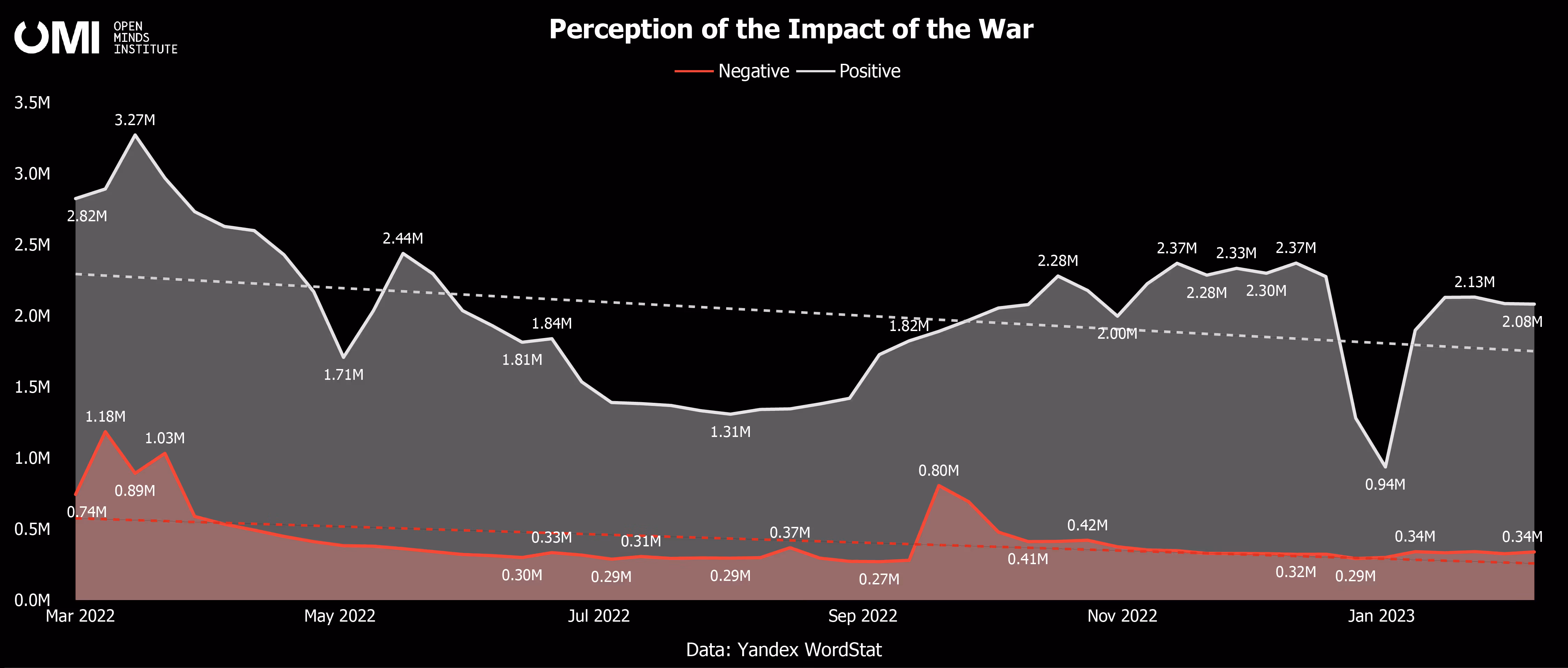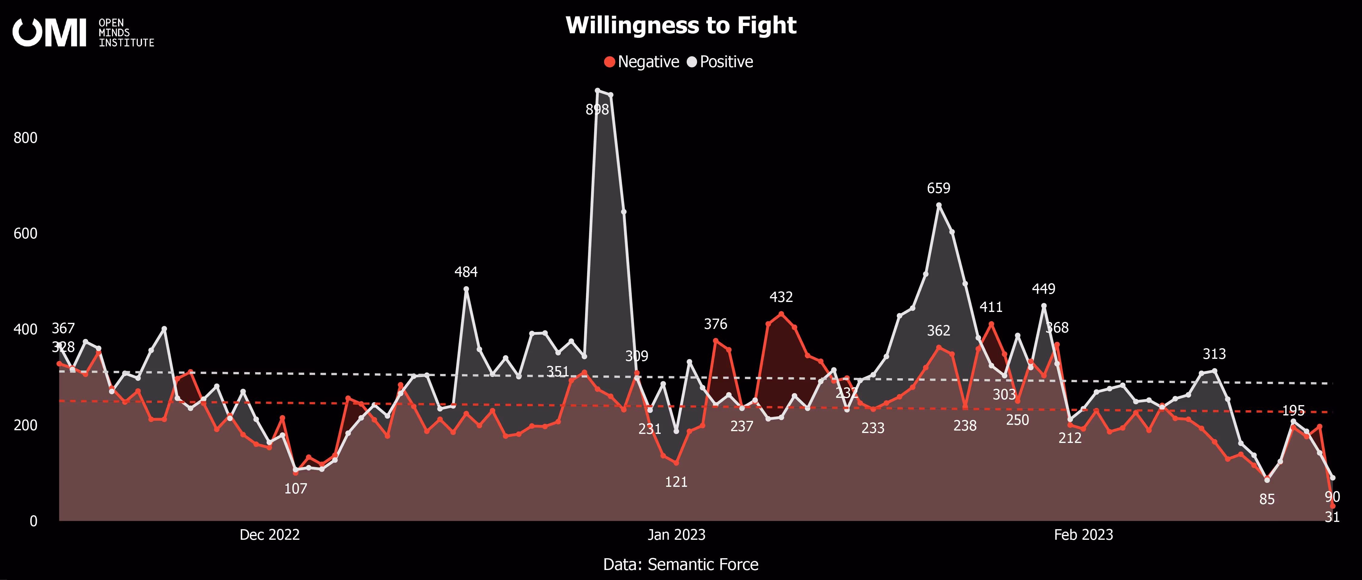 Looking at the last three months of the war, we observe that both negative and positive attitudes towards fighting remain relatively stable based on the trend lines of social media comments.