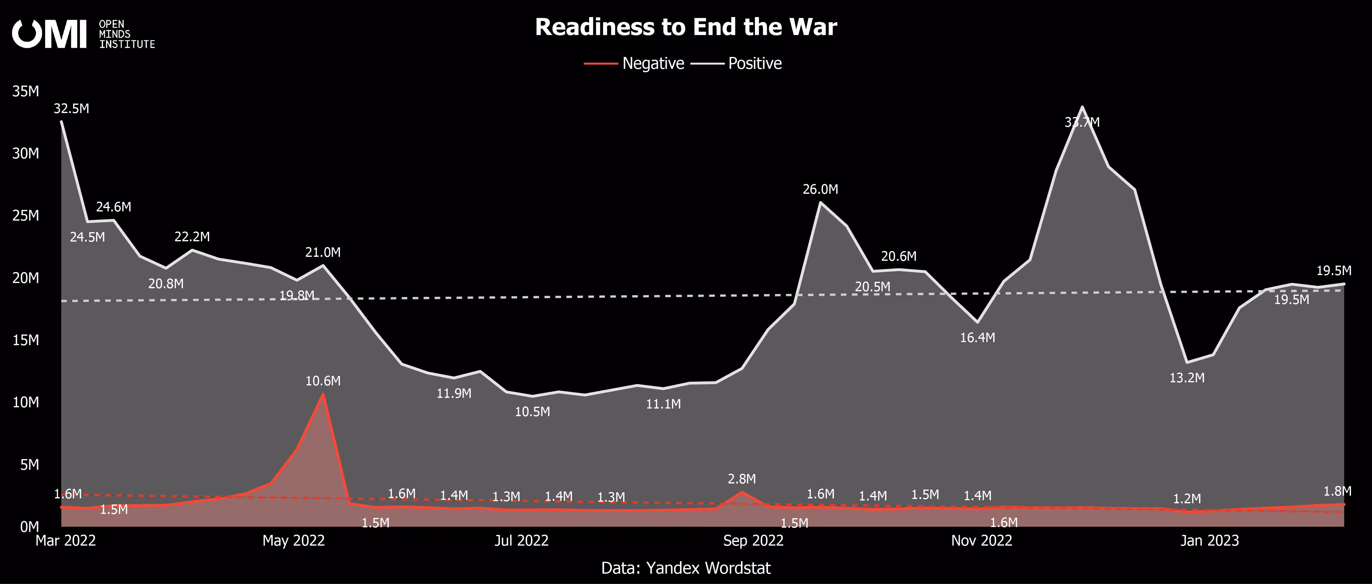 The positive attitude towards ending the war (e.g., “when will there be peace?,” “how to end the war”) varied throughout the year, with three main spikes in data - at the beginning of the war, in September when “partial“ mobilization in Russia was announced, and in November when the Ukrainian Armed Forces liberated the city of Kherson and missiles hit Polish soil.
