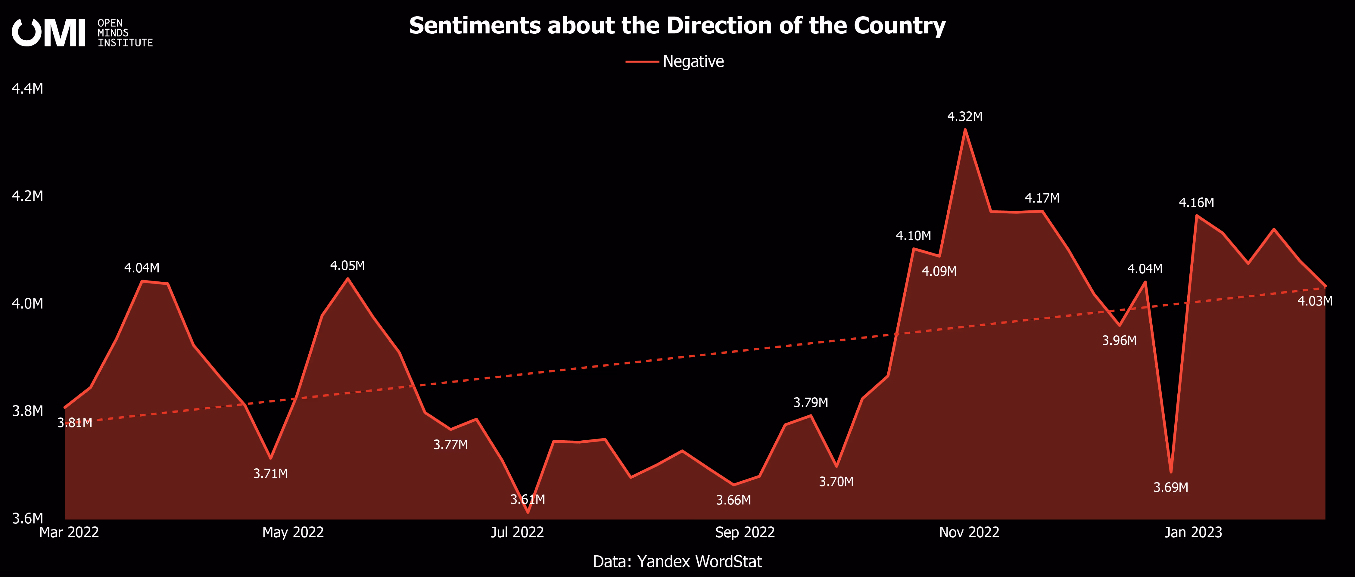 The highest spike in data occurred around October 31st, when Russia launched a mass air strike on Ukraine and the Russian-occupied Crimean naval base was attacked. This event led to increased searches expressing negative sentiment. Overall, the trend line suggests that throughout the year, Russians tend to reflect negatively on the direction of their country more.
