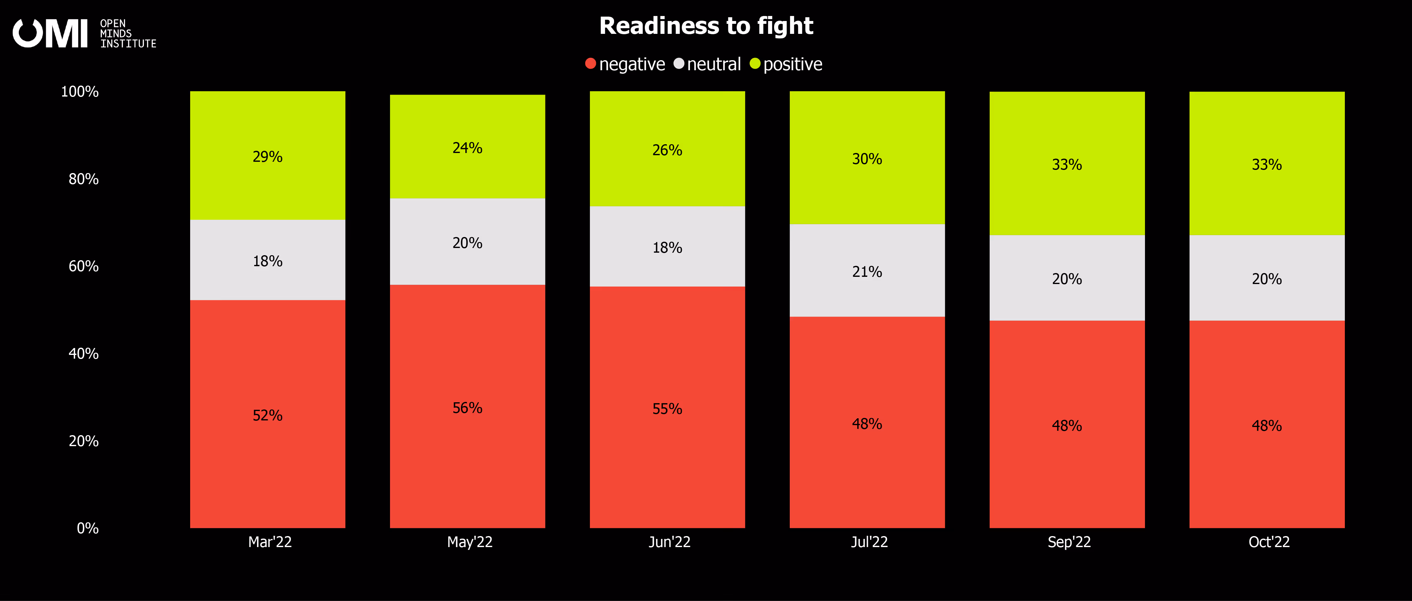 However, our online surveys revealed no significant differences in the readiness to fight among Russians in September and October, despite the conscription announcement. Based on the respondents' declared willingness to fight, we can conclude that there was an upward trend since July, with more people answering positively compared to the first three surveys.