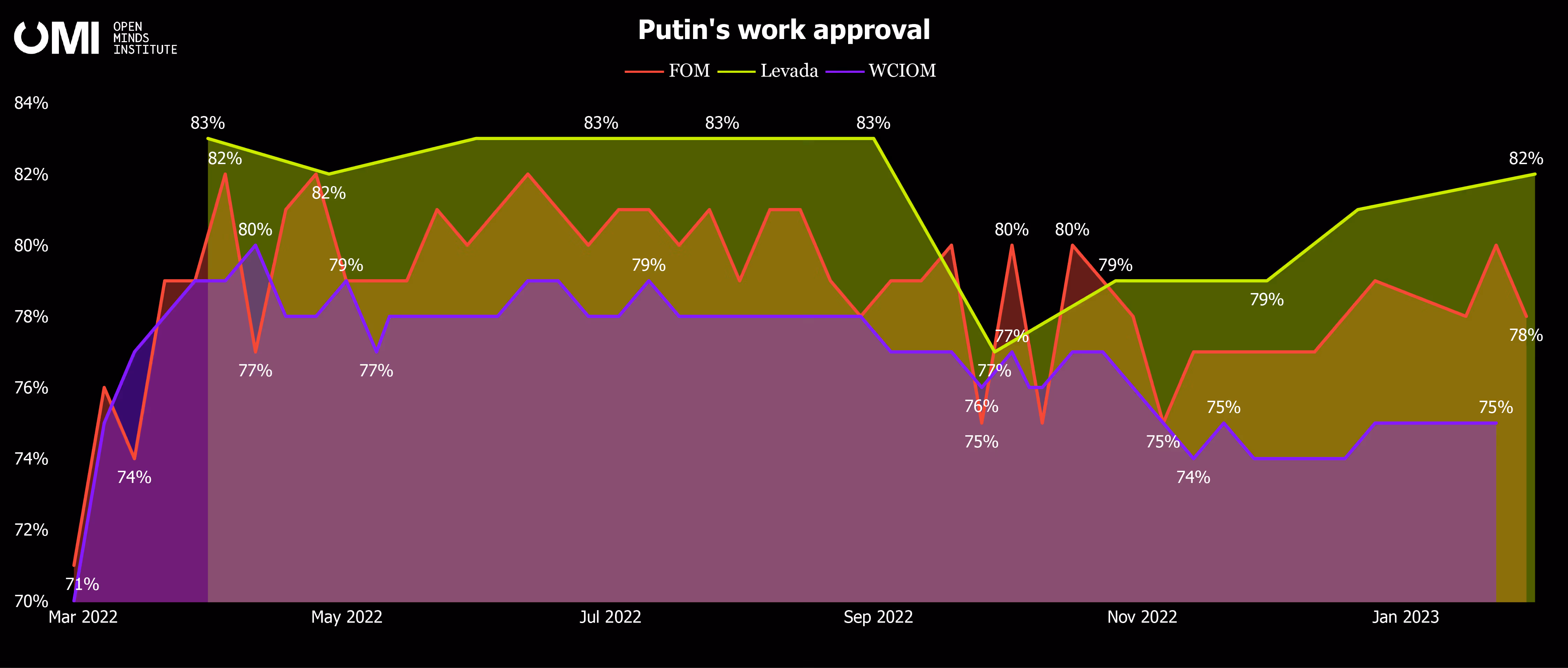 We can compare the results of three Russian sociological institutions (FOM, Levada, WCIOM), which conducted similar surveys during the year of the war. Based on such data, the Russian invasion of Ukraine only increased the number of Putin's supporters. Before the invasion, between 61% and 69% of people were satisfied with Putin's work. After the first month of the war, these numbers ranged between 75% and 82% up until the one-year anniversary.