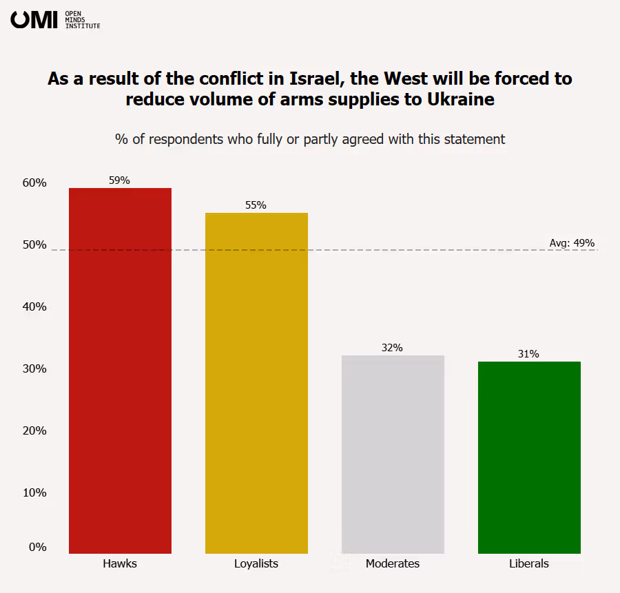 Respondents believe that Hamas's attack on Israel could influence the Russian-Ukrainian war, with Hawks and Loyalists anticipating a potential reduction in Western weapon supplies to Ukraine.