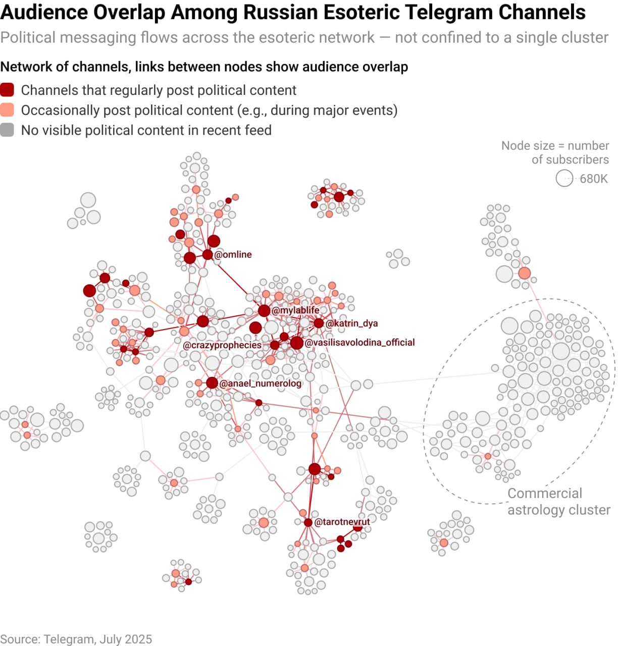 One might assume that this behavior is limited to marginal channels with niche followings—but the data suggests otherwise. When we mapped 730 Russian esoteric Telegram channels by shared audience, we found politically active and semi-political channels not isolated in some corner of the network, but scattered throughout it. There is significant audience overlap: users who follow seemingly "neutral" astrology channels also subscribe to ones that regularly—or at least occasionally—interpret current events through a cosmic lens.