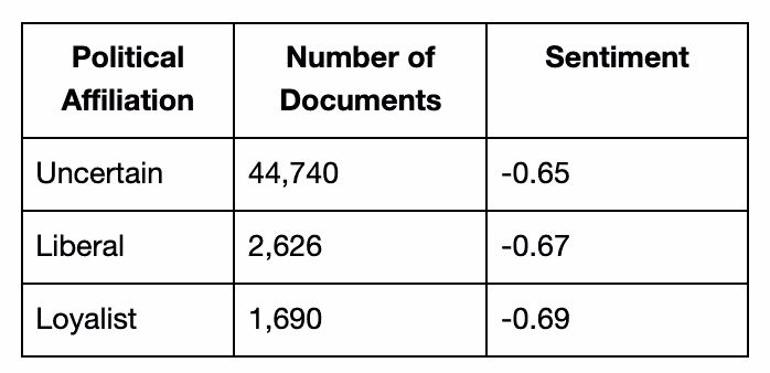 There are similar values in sentiment across different political affiliations. This means that all three groups produce negative content related to the damaged children’s hospital, but which is pointed at different actors. In the case of Loyalists it is Ukrainian air defence and in the case of Liberals it is the Russian army that launched the missile. Uncertain audience mostly aligned with Loyalists and only a fraction of it expressed an opposing point of view.