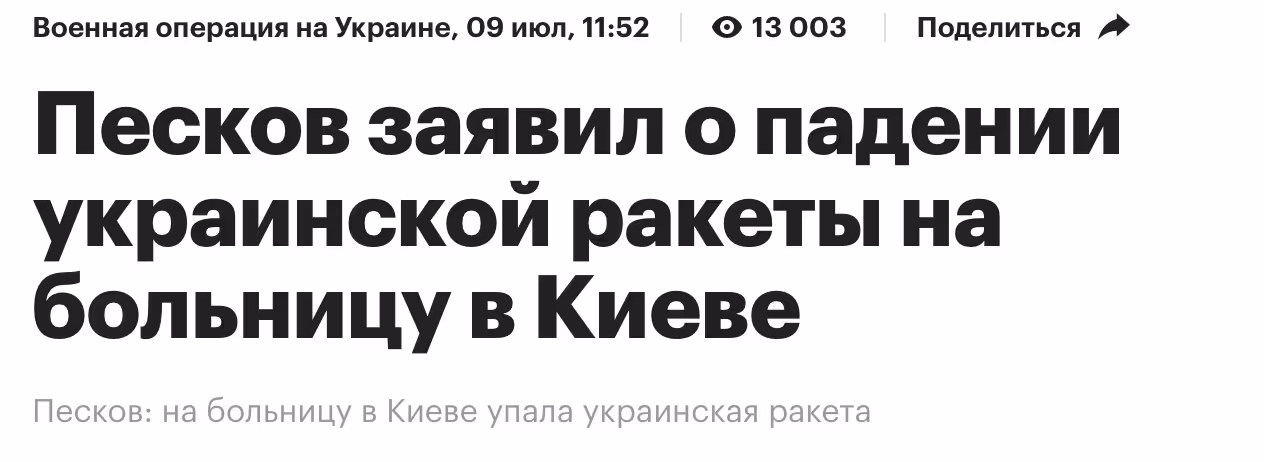 “The hit of a Ukrainian anti-missile missile at a children's hospital in Kyiv is a PR operation involving blood, Russian Presidential Press Secretary Dmitry Peskov said” [14]