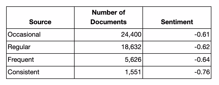 There is a clear difference in sentiment of Consistent audience compared to the rest. Since the sentiment here matches the sentiment of the media, we can claim that the reasons for this difference are similar to the ones in the Account Type breakdown.