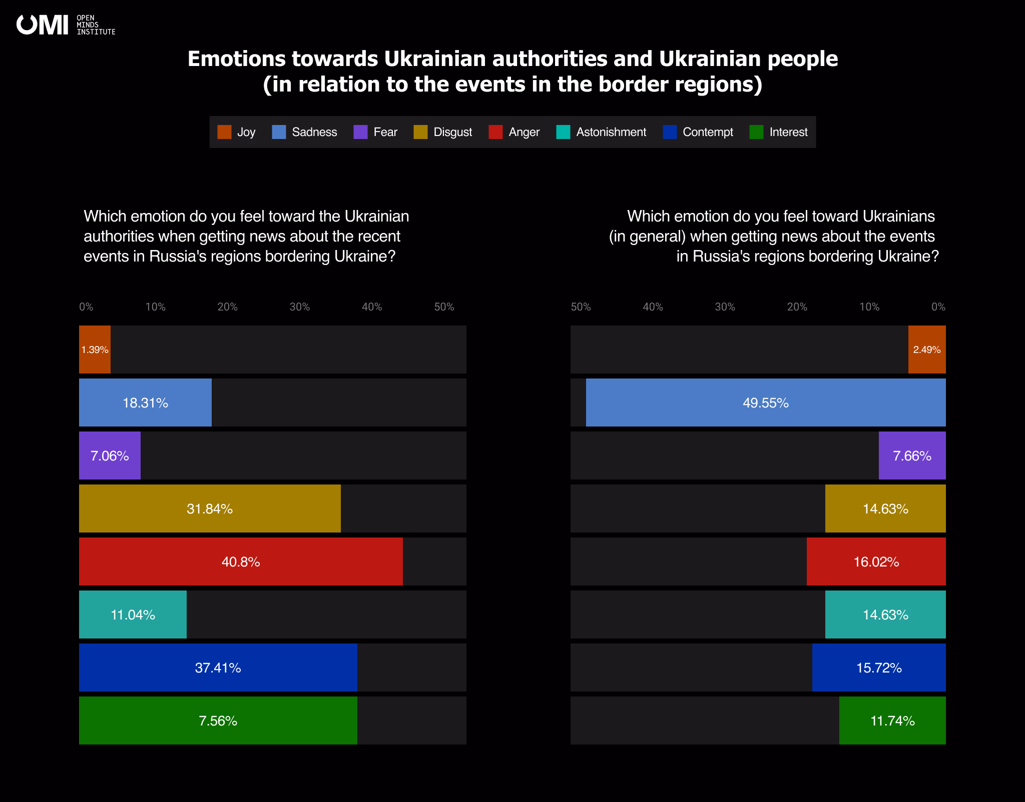 Feelings of sadness and fear tend to overshadow feelings of anger regarding the cross-border attacks on Russia's frontline regions. This suggests that the raids are not sparking a psychological rally against Ukraine. Instead, people are more prone to feelings of sadness and fear, emotions that generally promote passive rather than active responses.