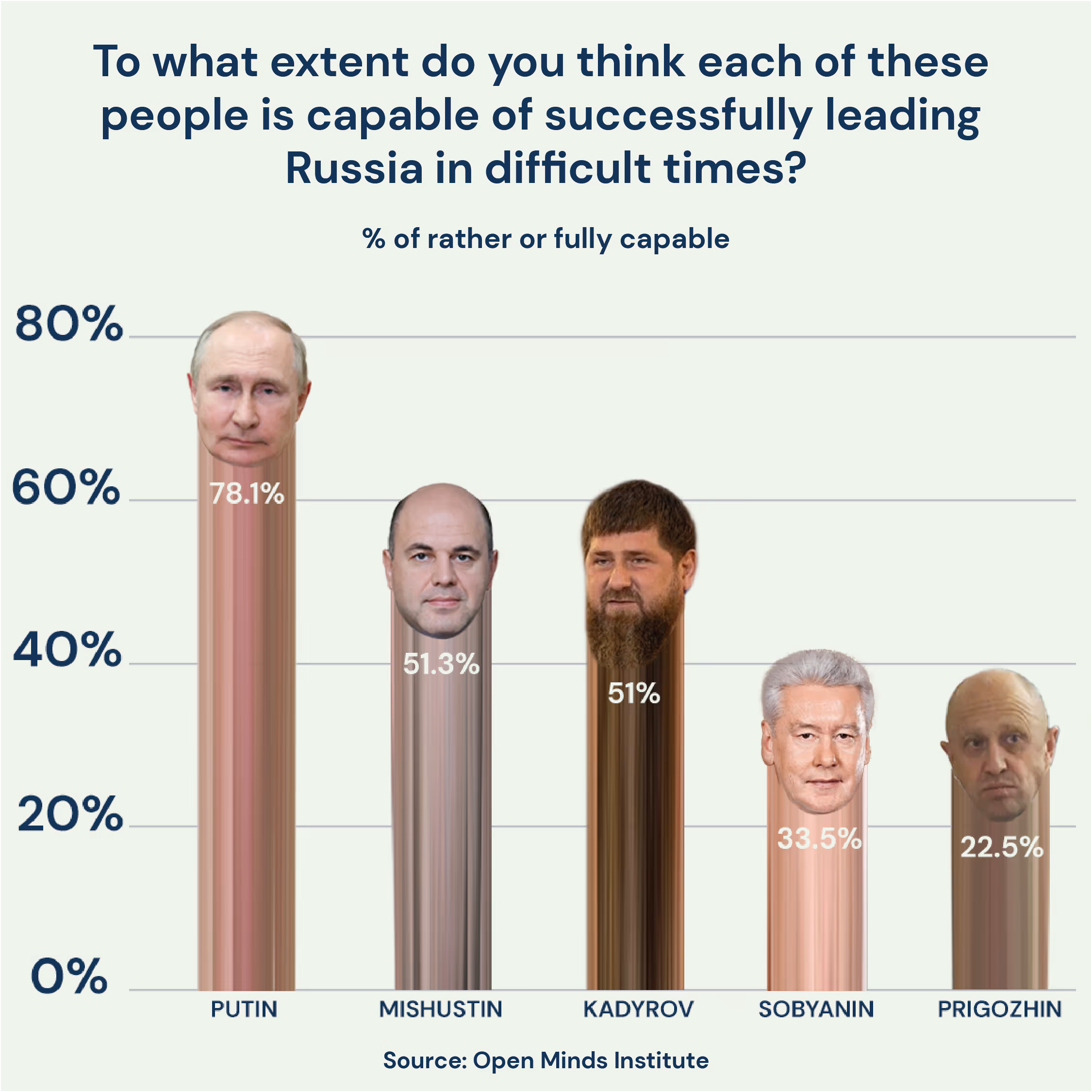 Respondents are confident that Vladimir Putin is the most suitable candidate for leading Russia during difficult and tough times. Following him, in descending order, are Mishustin, Kadyrov, Sobyanin, and Prigozhin.
